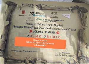 🏆🥇Grandi emozioni per i nostri alunni della classe 5^ sez.H per il meritatissimo e lusinghiero primo premio, sezione scuole primarie, al concorso Premio di Cultura P. Rosso di San Secondo e L.Sciascia 2025 “E quindi uscimmo a riveder le stelle”, promosso dalla Società Dante Alighieri di Caltanissetta, in collaborazione con “I Parchi letterari”, “La strada dei scrittori” e l’ Assessorato alla Cultura del Comune di Caltanissetta.
